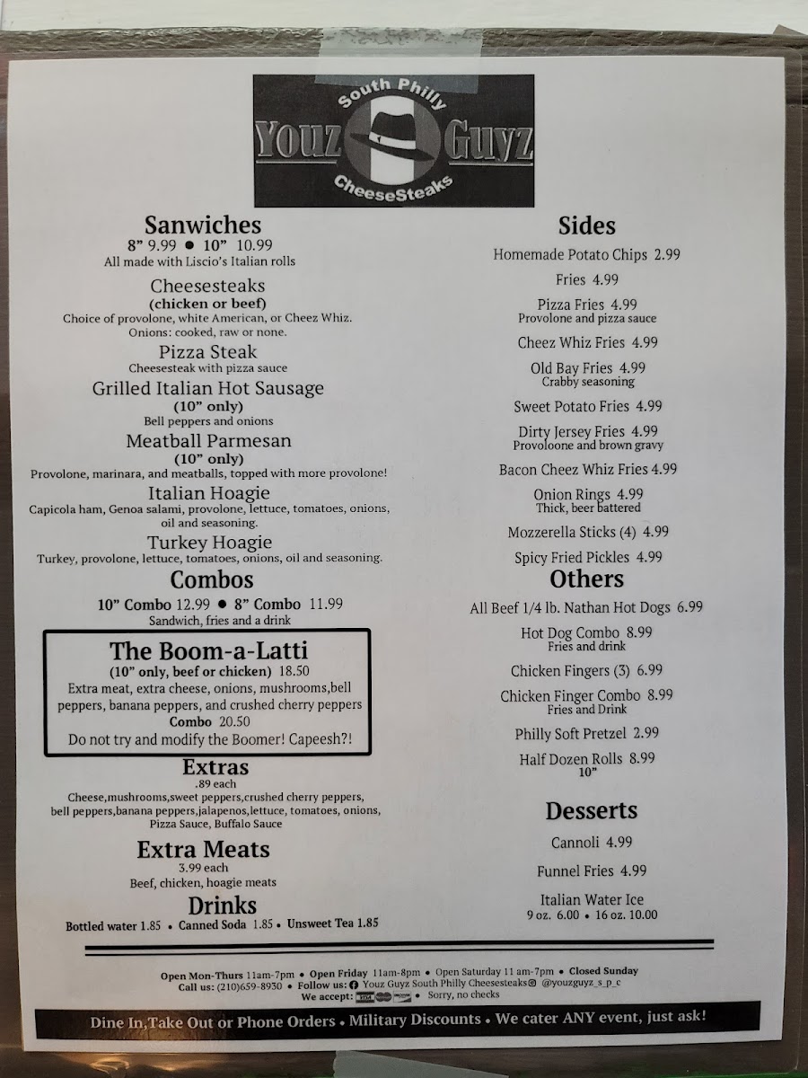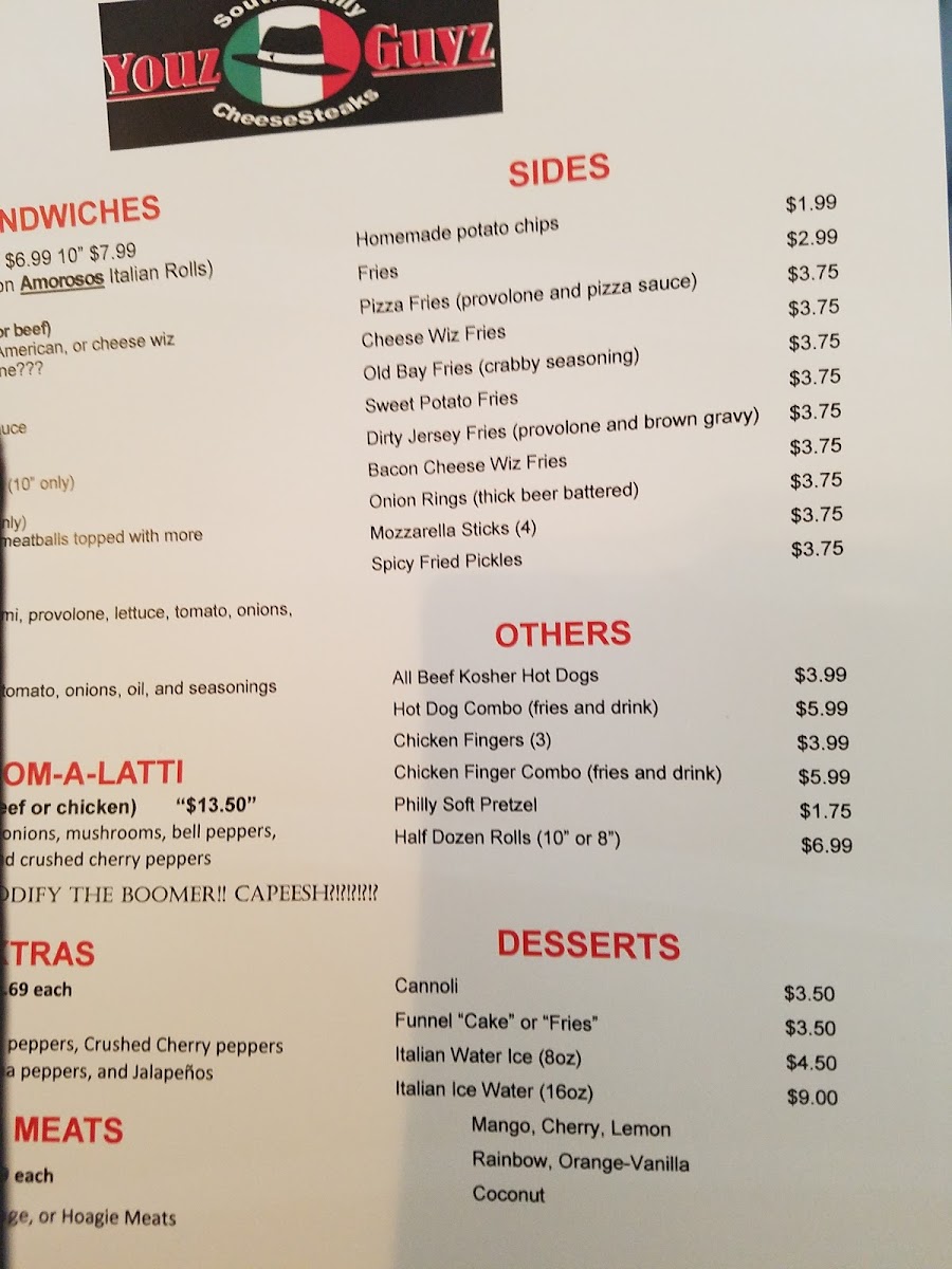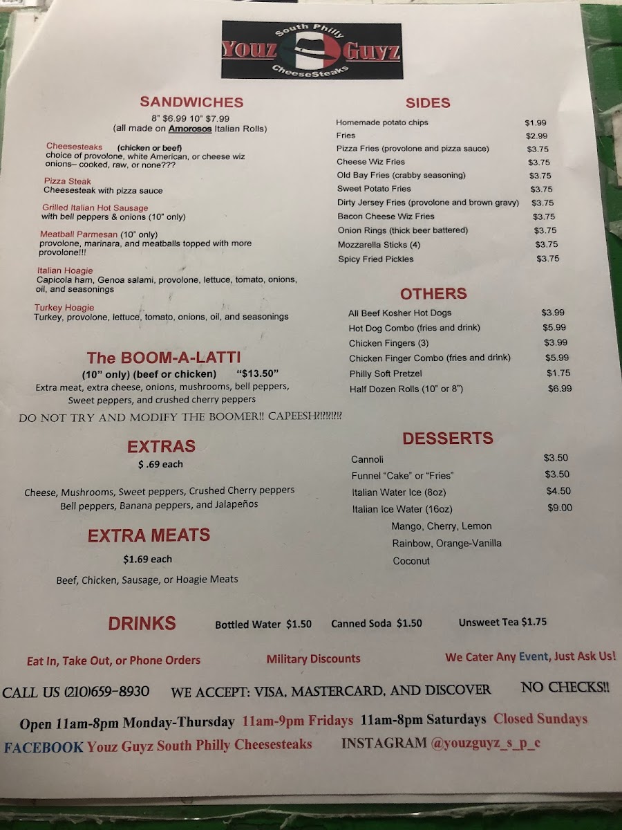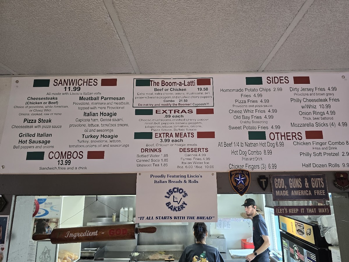 The menu offers a variety of classic Philadelphia-style cheesesteaks along with several additional sandwich options and sides. Customers can choose from cheesesteak sandwiches made with either chicken or beef, with cheese selections including provolone, white American, or Cheez Whiz. These are served on authentic Amoroso's hoagie rolls and can be customized with cooked or raw onions.