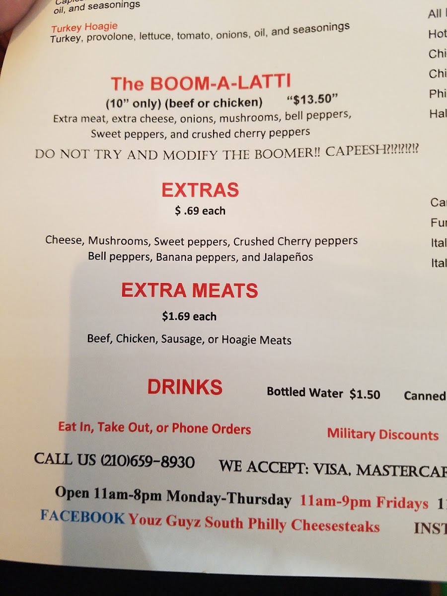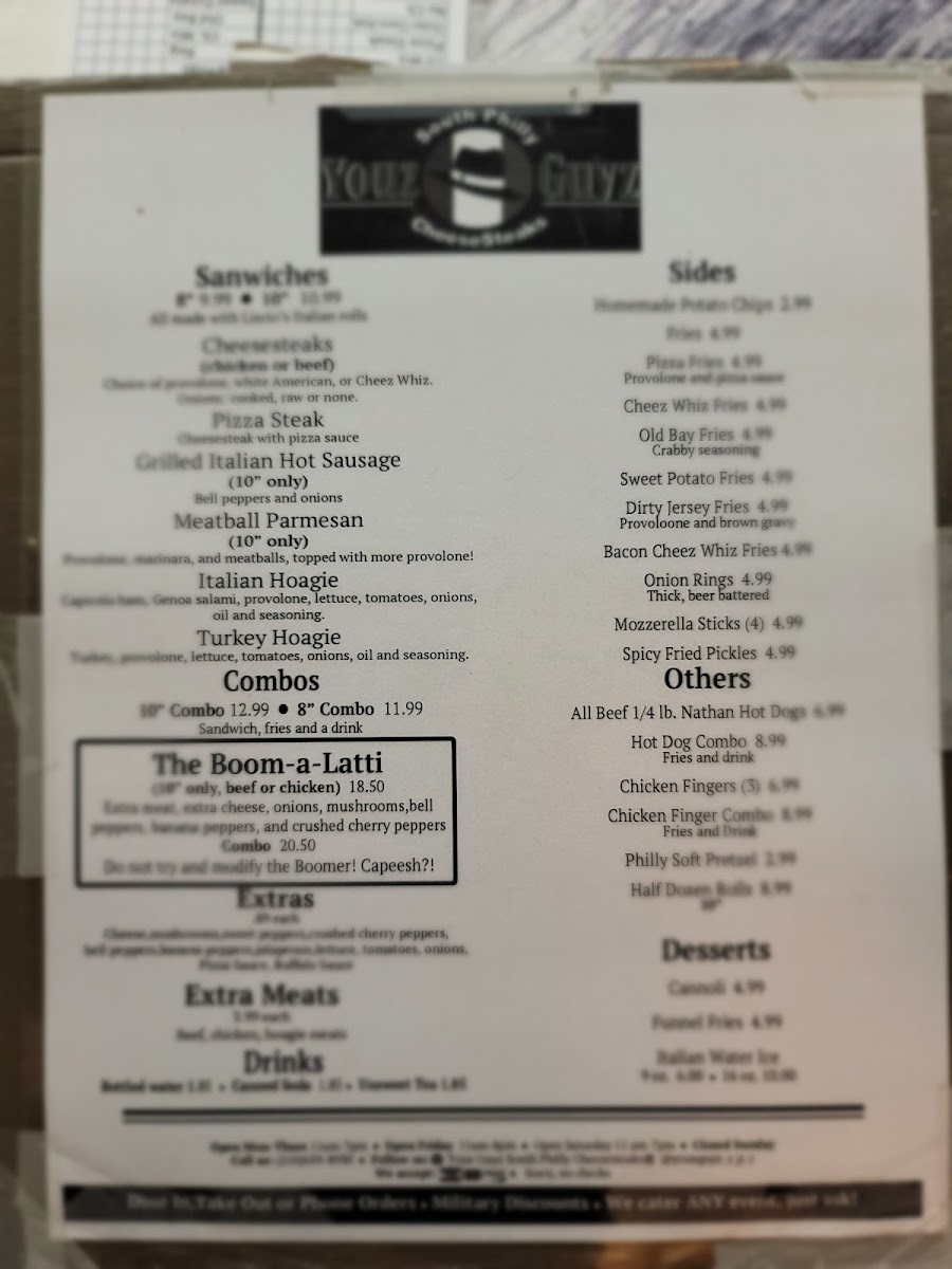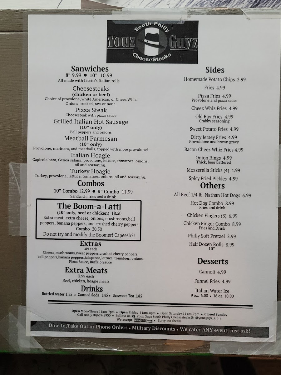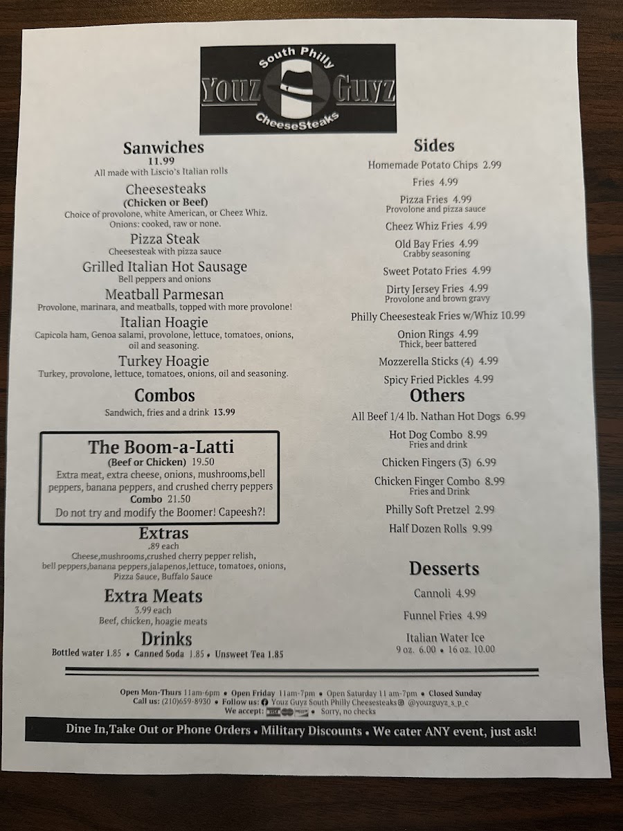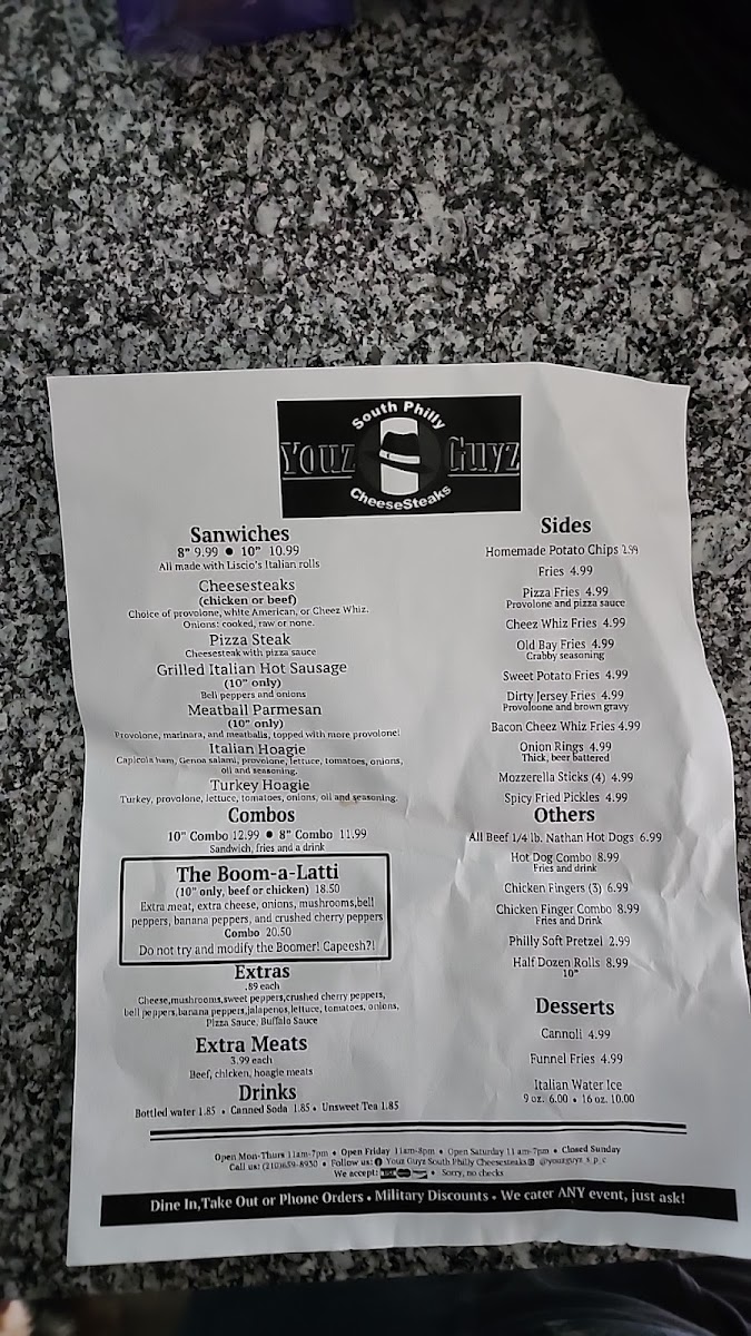 The menu offers a variety of classic Philadelphia-style cheesesteaks along with several additional sandwich options and sides. Customers can choose from cheesesteak sandwiches made with either chicken or beef, with cheese selections including provolone, white American, or Cheez Whiz. These are served on authentic Amoroso's hoagie rolls and can be customized with cooked or raw onions.