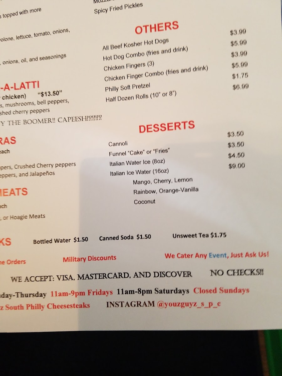 For beverages and desserts, Italian Ice is available alongside soft drink options such as Dr Pepper.